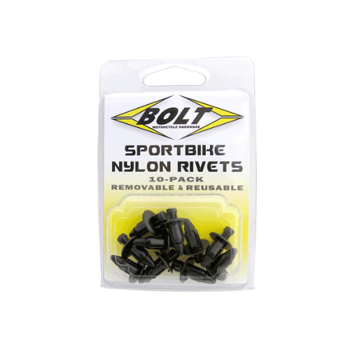 Removable, reusable, black nylon push rivets are found on ATV's, sportbikes, motor scooters, SXS and UTVs