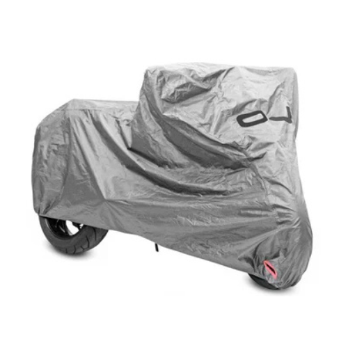 Waterproof coated polyester motorcycle cover with heat-sealed seams and lining. Recommended for use in closed environments (e.g. garages).