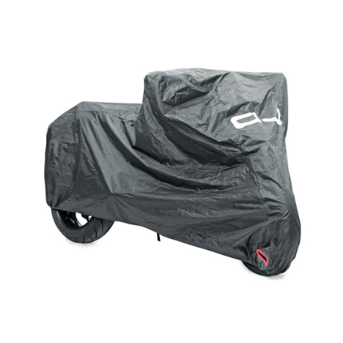 Waterproof coated polyester motorcycle cover with heat-sealed seams and lining. Recommended for use in closed environments (e.g. garages).